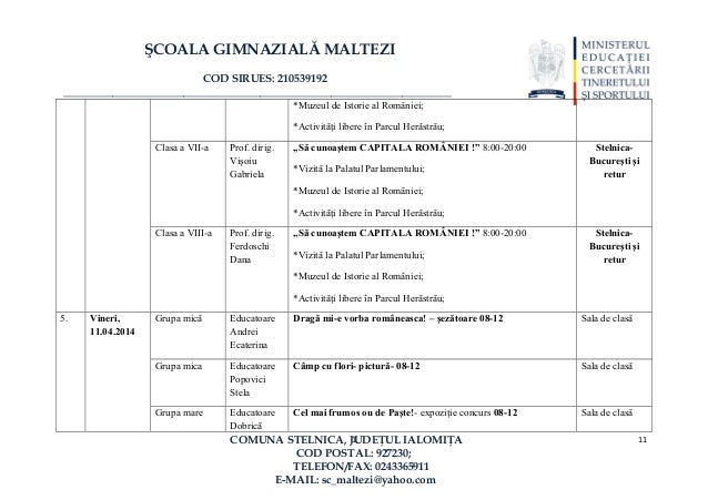 In programul scoala altfel educatorii, institutorii si profesoriir au un rol foarte important, ei fiind cei care stabilesc programul activitatilor, pe. Programul urmareste implicarea tuturor prescolarilor, a educatoarelor si a parintilor in activitati care sa raspunda intereselor si preocuparilor diverse ale copiilor, sa puna in valoare talentele si capacitatile acestora in diferite domenii. Ghidul de activitati scoala altfel. Localitatea drăgănești, judetul prahova, cod sirues 637839, cf 29055470 unitate cu personalitate juridică. Raport final program „scoala altfel.