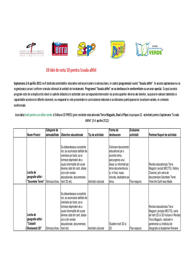 Sugestii si solutii pentru parintii si copiii bine informati, care tin pasul cu tot ce este actual in domeniul educatiei. Fiecare institutie de invatamant isi poate stabili propriul program de activitati, pe baza propunerilor primite de la elevi, cadre didactice si parinti. Limba franceza invatarea limbii franceze la euro kid cuprinde urmatoarele tipuri de programe: În cadrul săptămâna „școala altfel au loc urmatoarele activități: Şcoala altfel ,, din natura spre cultura scopul proiectului „şcoala altfel 3.