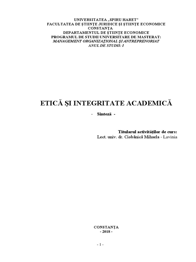 vizitati articolul complet aici : 2 Toate rezultatele despre etica si integritate academica. O altă lucrare utilă este deontologie academică. Cunoașterea elementelor relevante de etică, integritate academică și deontologie profesională, înțelegerea și folosirea lor în planificarea și realizarea.