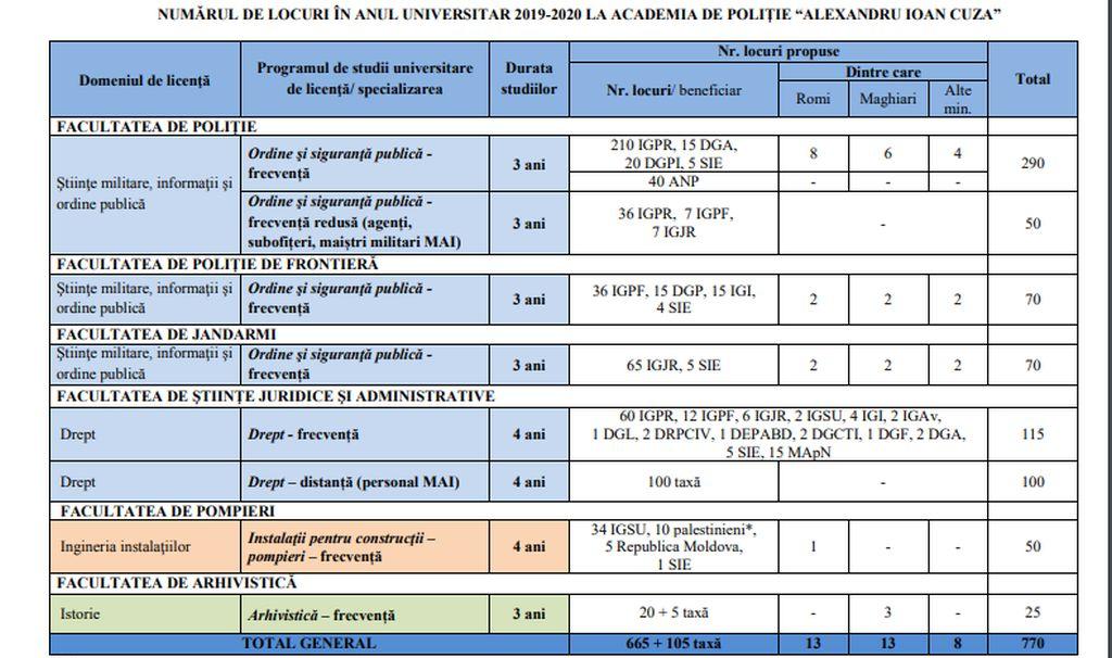 • care sunt numărul de locuri de la academia de poliție alexandru ioan cuza?